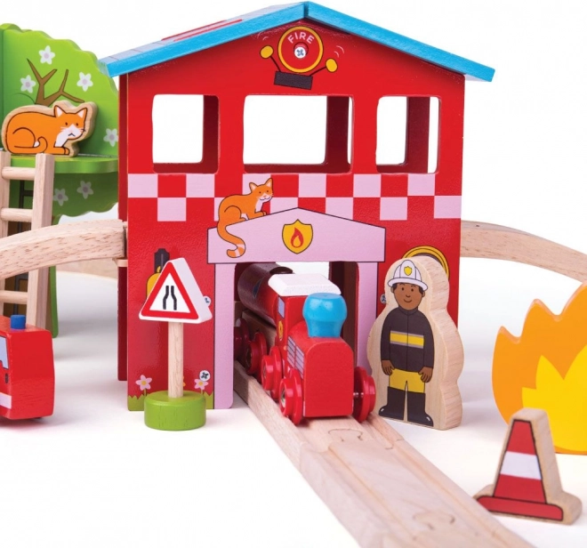 Táto drevená vláčikodráha s motívom hasičskej stanice premení každú izbu na záchranárske centrum. Deti môžu prechádzať tunelom hasičskej zbrojnice, pretekať sa s hasičským vozidlom, posielať záchranný vlak s odnímateľnými vozňami a pomáhať hasičom s rebríkom či hydrantom. Vďaka pestrým detailom a robustnému prevedeniu hračka skvele rozvíja predstavivosť a učí deti riešiť situácie.