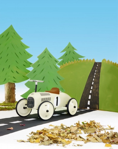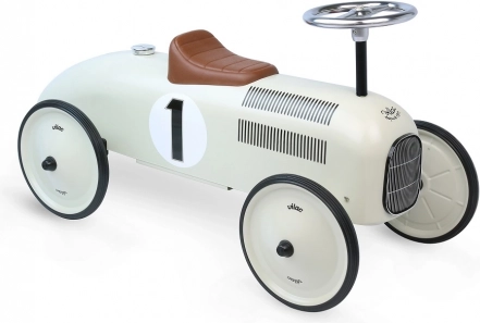 Štýlové detské odrážadlo v vzhľade pretekárskeho vozidla zaujme svojím retro šarmom a kvalitným kovovým spracovaním. Ponúka tichú jazdu vďaka pogumovaným kolesám, jednoduché riadenie volantom a pevnú konštrukciu s nosnosťou 20 kg – ideálne pre malých pretekárov od 1,5 roka.
