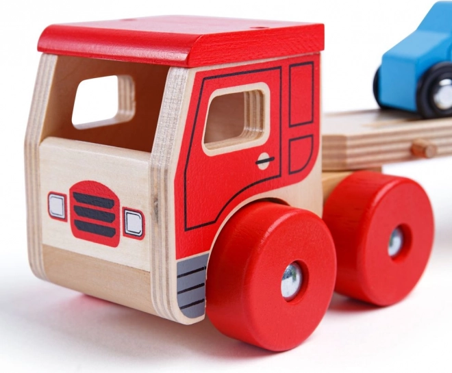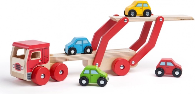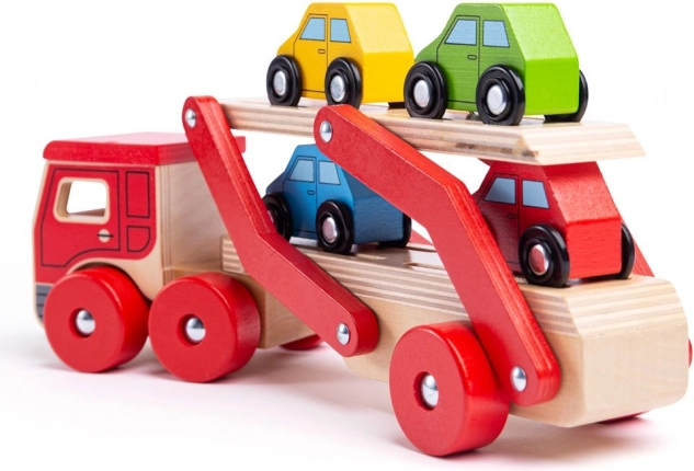 Bigjigs Toys prináša deťom nekonečnú zábavu s dreveným kamiónom s autami, ktorý poskytuje nielen hodiny hrania, ale tiež podporuje rozvoj koordinácie rúk a očí. Hornú časť návesu možno ľahko znížiť, čo umožňuje jednoduchý nájazd a zjazd malých vozidiel.