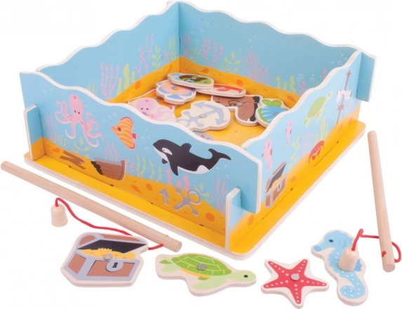 Deti pomocou magnetických prútov lovia 11 rybičiek a ďalšie kúsky, ako je truhlica s pokladom, topánka či kotva, a trénujú presnosť pri ich ukladaní na správne miesta. Kvalitné drevené spracovanie a bezpečné farby zaručujú dlhú životnosť a bezpečné hranie.