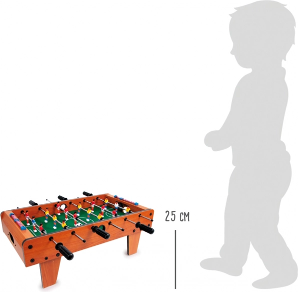 Veľký stolný futbal small foot je ideálna rodinná hra, ktorá sa ľahko položí na akýkoľvek stôl. Vďaka kompaktným rozmerom a pevnému spracovaniu z lakovaného dreva, kovu a odolného plastu je pripravený na každodenné zápasy. Zelené ihrisko s rozmermi 60 × 34 cm ponúkne plynulú hru a pohodlné ovládanie hráčov.