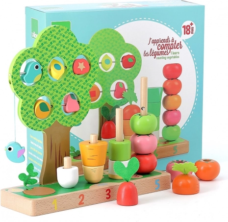 Táto kvalitná drevená hračka spája zábavu a učenie v jednom. Deti skladajú a navliekajú mrkvu, pór, paradajky a ďalšie tvary na očíslované kolíky 1–5, čím si prirodzene osvojujú počítanie aj triedenie podľa farieb a veľkostí. Súčasťou je aj stromček s posuvnými prvkami na objavovanie a tréning koordinácie oko–ruka.