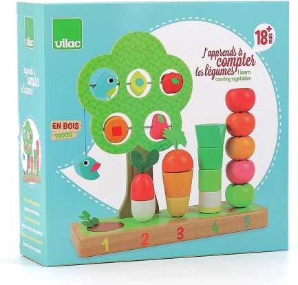 Objavte hravú drevenú sadu Vilac, ktorá deťom pomôže naučiť sa počítať, rozpoznávať farby a tvary a zároveň trénovať jemnú motoriku. Farebné dieliky zeleniny a ovocia sa nasadzujú na očíslované kolíky a po stromčeku sa posúvajú koráliky – bezpečná a odolná konštrukcia je ideálna pre deti od 18 mesiacov.