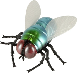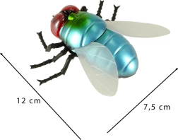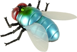 Metalické modro‑zelené telo, červené oči a priehľadné krídla robia z hračky vernú napodobeninu muchy – perfektné na žartíky aj výučbu.