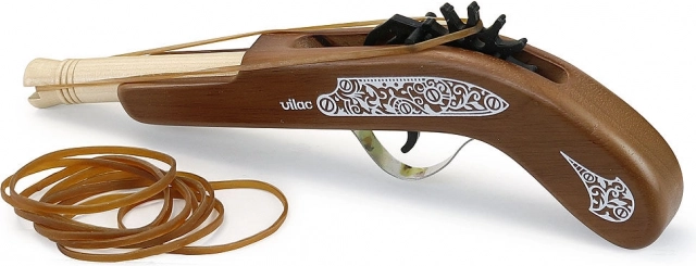 Drevená pirátska pištoľ od značky Vilac je ideálna hračka pre malých nadšencov do pirátskych dobrodružstiev. Umožňuje deťom trénovať streľbu na cieľ pomocou bezpečných gumičiek, ktoré sú súčasťou balenia.