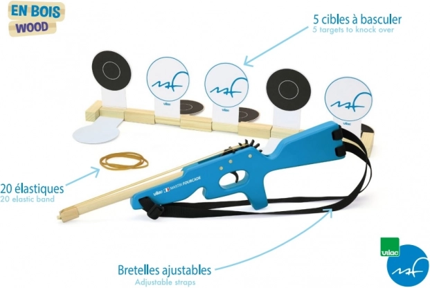 Drevená puška je vybavená nastaviteľnými textilnými popruhmi, ideálne pre každé dieťa. Balenie obsahuje päť sklápacích terčov a dvadsať gumičiek pre opakovanú streľbu. Skúste nastaviť terče na rôznu vzdialenosť a vyskúšajte svoju presnosť!