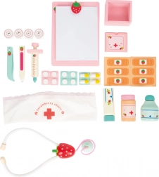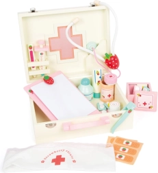Tento kvalitný drevený lekársky kufrík Small Foot Isabel je ideálny na detské hry na povolania. Set obsahuje 24 kusov príslušenstva vrátane textilnej čelenky s červeným krížom a farebných lekárskych nástrojov s jahodovým motívom, ktoré potešia každé dieťa.