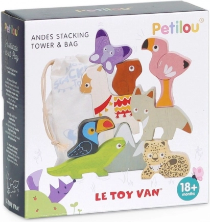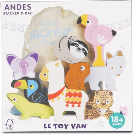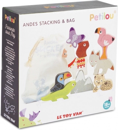 Táto andská skladacia veža prináša deťom dobrodružstvo z hôr priamo do detskej izby. Sada obsahuje robustné drevené figúrky zvierat (napr. lama, plameniak, tukan, jašterica, motýľ, leňochod) a diel hory, ktoré možno stavať, vyvažovať a kombinovať do zábavných zostáv.