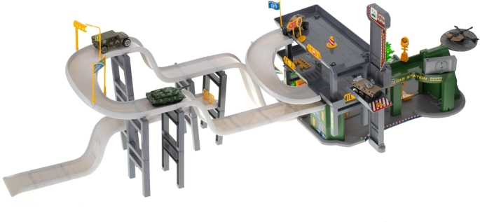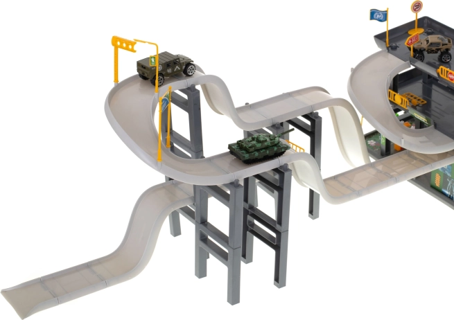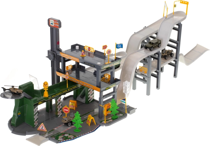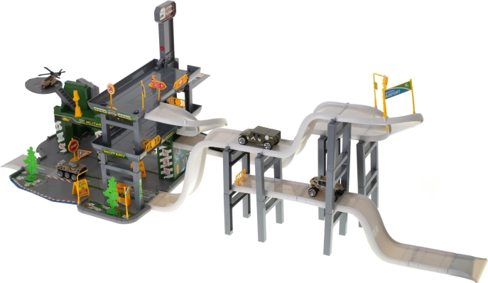 V centre sa nachádza trojpodlažná stavba - parkovisko, ktoré je prepojené komunikáciami s ďalšími úrovňami. Odtiaľ môžete vyjsť priamo na vysokú trať. Postavte naň svoje auto a uvidíte, ako rýchlo zíde až dolu! V hornom poschodí je tiež pristávacia plocha pre vrtuľníky. V prízemí sa nachádza čerpacia stanica s benzínovými čerpadlami, kde si vozidlá môžu doplniť palivo pred ďalším vzrušujúcim dobrodružstvom! V sade nájdete 4 vozidlá vyrobené s veľkým dôrazom na detaily: terénne osobné auto, terénne nákladné auto, terénny transportér, obrnený tank, vrtuľník! Každé vozidlo má pohyblivé kolesá a dokonale reprodukovaný vojenský náter. Vrtuľník má odnímateľné pohyblivé vrtule. Všetky stroje sú v kamuflážnych farbách, ako sa na armádne vozidlá sluší a patrí. S takou sadou je každá vojenská operácia odsúdená na úspech! V estetickom poli nájdete množstvo prvkov terénnej infraštruktúry, ako sú rastliny, značky, semafory, značky alebo bariéry. Súčasťou sady je tiež veľký arch samolepiek, ktoré celú stavbu oživia. Táto sada je skvelou príležitosťou na spoločné trávenie času s rovesníkmi aj s dospelými. Táto hračka umožňuje tvoriť, objavovať, rozvíjať predstavivosť a má pozitívny vplyv na jemnú motoriku vášho batoľaťa.