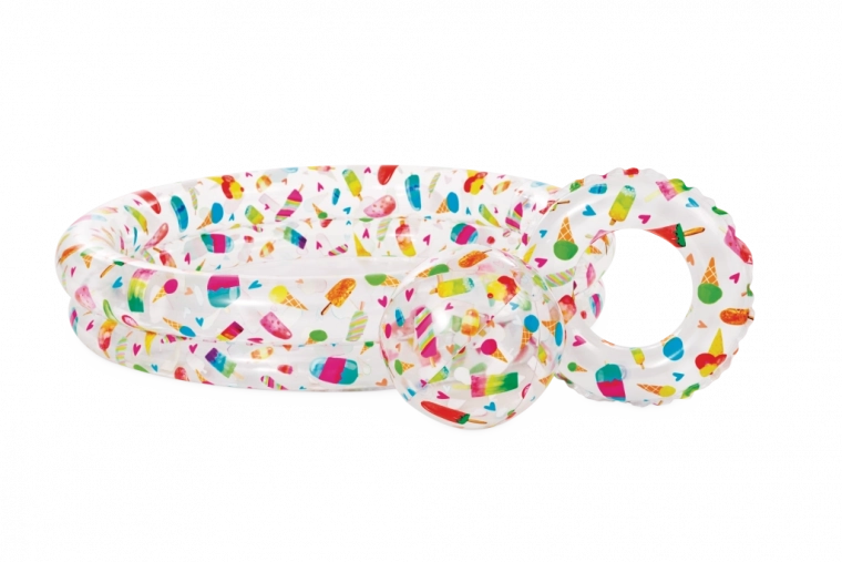 - Kompletný set: bazén + plávací kruh + plážová lopta