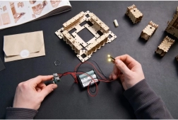 Sada obsahuje 340 presne vyrezaných drevených dielikov a podrobný návod. Skladanie zvládnu aj šikovnejší začiatočníci, model pritom ponúkne dosť výzvy aj pokročilým. Napájanie je riešené voliteľne cez USB‑C alebo 3× AA (nie je súčasťou balenia), takže model ľahko začleníte do akéhokoľvek priestoru.