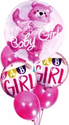 - 1× balónik s medvedíkom a nápisom „Baby Girl“, 2× balónik s girlandou a nápisom „Baby Girl“, 3× ružové balóniky bez potlače