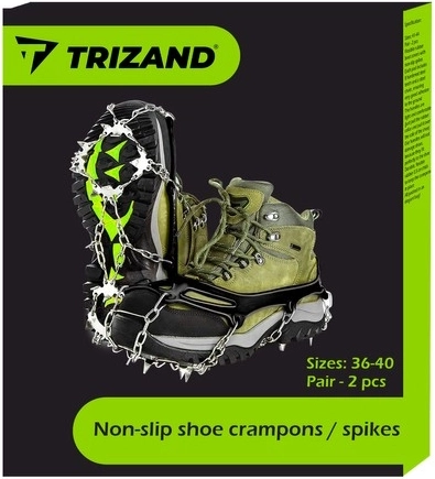 Protišmykové návleky TRIZAND sú ideálnou voľbou na zimnú turistiku, chôdzu v meste aj prechádzky v prírode. Každý návlek je vybavený 8 oceľovými hrotmi spojenými nerezovými reťazami, ktoré zvyšujú stabilitu na zľadovatenom či podmáčanom povrchu. Odolné materiály a premyslená konštrukcia chránia obuv a zaisťujú dlhú životnosť.