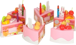 Objavte čaro narodeninovej oslavy každý deň. Detská ružová torta z 6 dielikov s nápisom „Happy Birthday“ sa dá ľahko rozobrať a znovu zostaviť vďaka suchým zipsom. Malí kuchári si ju ozdobia podľa nálady – sviečkami, zajačikmi a farebným ovocím – a naservírujú na tanieriky.