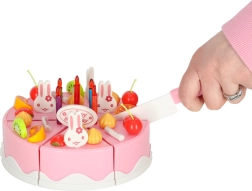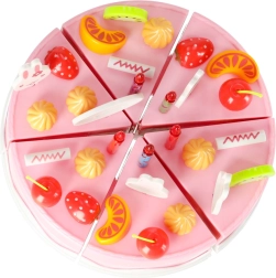 Veselá ružová sada s tortou na krájanie poteší malých cukrárov od 3 rokov. Torta zo 6 dielikov sa spája pomocou suchých zipsov a dá sa krájať plastovým nožom. Bohatá výbava ovocia, ozdôb a náradia podporuje fantáziu, rolové hry a jemnú motoriku.