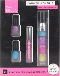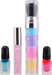 - Kompletná výbava: očné tiene, lesk na pery a 2× lak na nechty