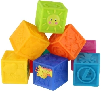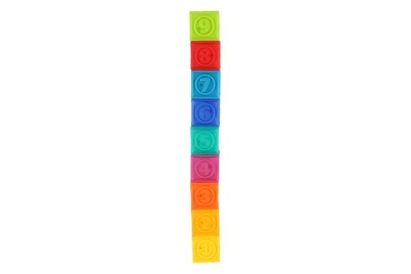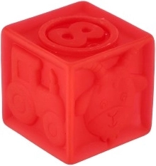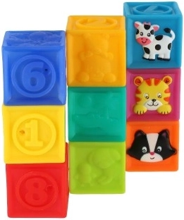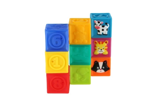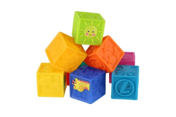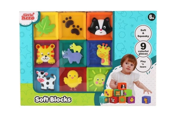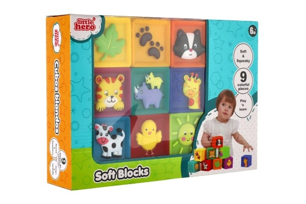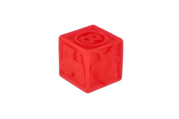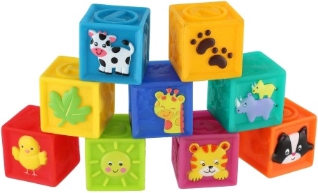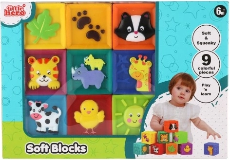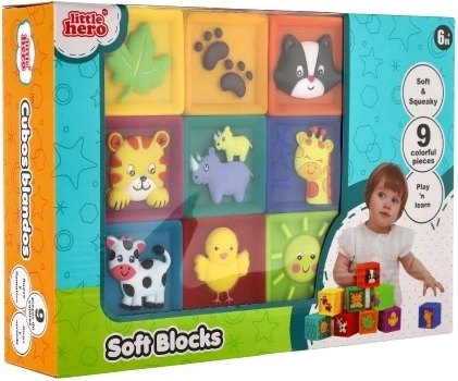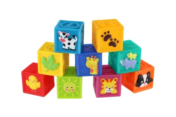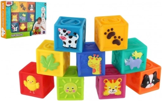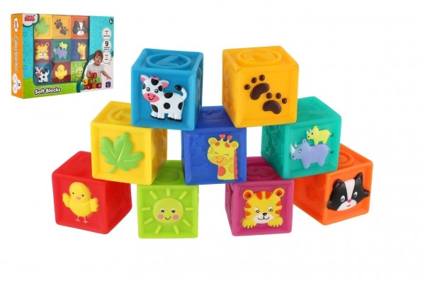 Táto sada 9 mäkkých gumových kociek je navrhnutá na bezpečné hranie dojčiat a batoliat. Hebký a poddajný materiál je príjemný na dotyk, kocky sa ľahko stláčajú a vďaka embosovaným motívom lákajú deti k objavovaniu. Rozmer 5 × 5 × 5 cm je ideálny pre malé detské rúčky.