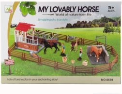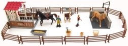 - Výbeh s ohradou, 2 figúrky koní, ošetrovatelia, príslušenstvo na starostlivosť (sedlá, krmivo, čistiace a sprchové doplnky)