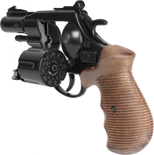 Objavte zábavu s policajným revolverom z edície Gold Collection. Tento model v elegantnej čiernej farbe kombinuje pevné kovové telo, pohodlnú rukoväť a realistické detaily vrátane otočného valca. Je určený pre kapslíky (12 rán), ktoré vytvárajú autentický zvukový efekt, a pritom zachovávajú bezpečnosť hry.