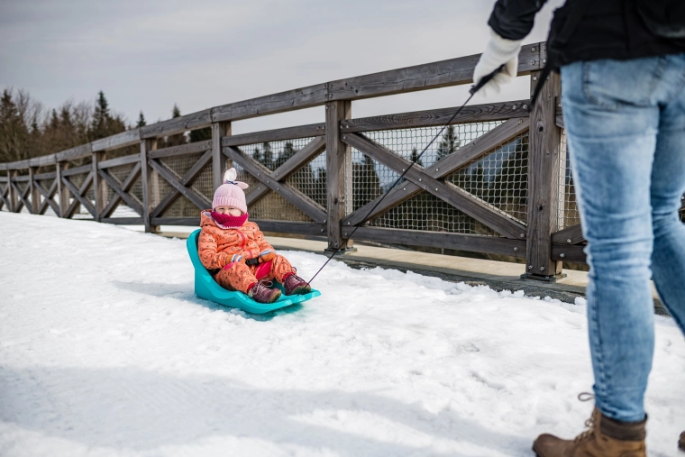 Praktické ťažné lano s madlom umožní rodičom ľahko ťahať boby po snehu aj na dlhších trasách.