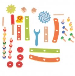Súčasťou je drevený skrutkovač a kľúč, takže malí stavitelia majú všetko, čo potrebujú. Pestrofarebné diely s hravými motívmi (napr. levík a ozubené kolesá) podporujú kreatívnu hru a učia rozpoznávať farby. Skvelý tip na edukačnú hračku aj darček, ktorý zabaví na hodiny.