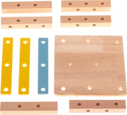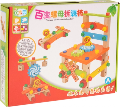 Táto kvalitná drevená sada umožní deťom zostaviť dielenskú stoličku aj ďalšie originálne modely. Vďaka skrutkám, maticiam a ozubeným kolieskam deti skúmajú princípy jednoduchej mechaniky, trénujú sústredenie a zručnosť. Stolička je stabilná a vďaka premyslenému systému otvorov a spojov ponúka množstvo kombinácií.
