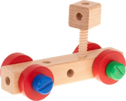 Súčasťou je drevený skrutkovač, kľúč, skrutky a matice – deti sa učia správne spájať diely a rozvíjajú jemnú motoriku.