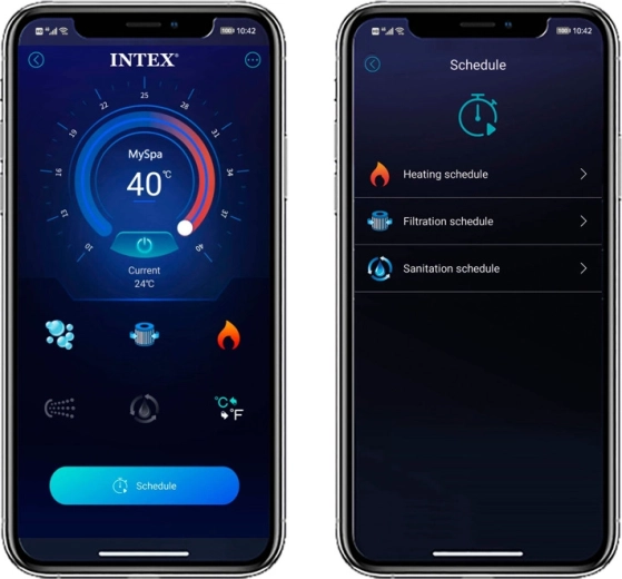 Intuitívny vodoodolný ovládací panel alebo inteligentná aplikácia umožní nastavenie teploty 10–40 °C, aktiváciu masáže aj plánovanie ohrevu. Úsporný systém vyhrievania s výkonom 2200 W a premyslená izolácia znižujú tepelné straty a udržia vodu dlhšie teplú.