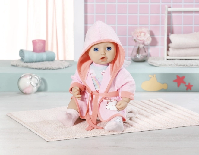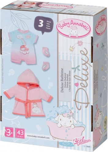 Nechajte svoju Baby Annabell zažiť čarovné chvíle s týmto štýlovým županom a pyžamkom. Župan je ozdobený krídelkami, ktoré z neho robia nielen módny, ale aj pohodlný doplnok pre hru. Pod županom nosí bábika krátky overal s potlačou ovečky užívajúci si dúhovú sprchu. Aby boli nožičky bábiky pekne v teple, súprava obsahuje taktiež ružové ponožky s obrázkami krídel.