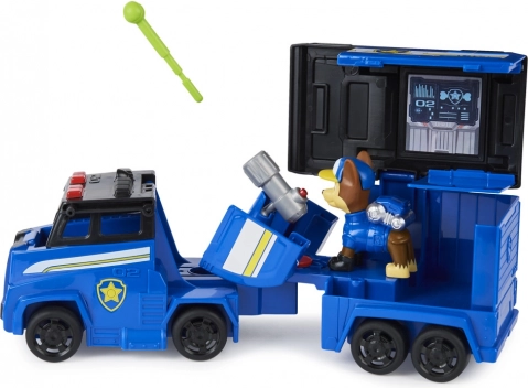 Vozidlo Paw Patrol Big Trucks Chase sa premení na mobilnú jazdu centrum, ktoré odhaľuje odpaľovače tenisových loptičiek a kazety.