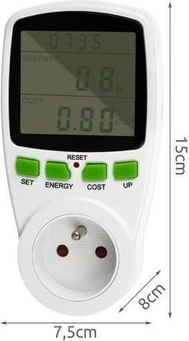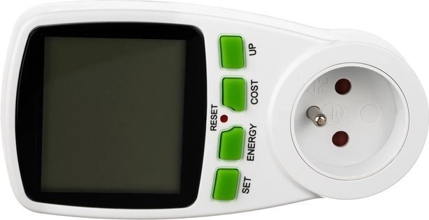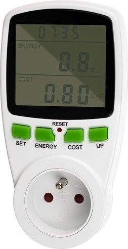 Merací prístroj má veľký, ľahko čitateľný displej, ktorý vám umožní presne odčítať údaje, ako sú: napätie, prúd, frekvencia, výkon, minimálny výkon, maximálny výkon, aktuálny výkon, spotrebovaná energia a náklady na spotrebu.