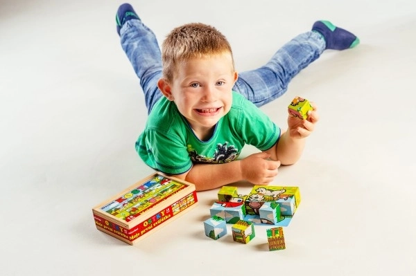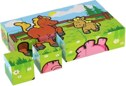 Drevené kocky s farebnými obrázkami rôznych domácich zvierat sú skvelým nástrojom pre rozvoj detí. Pri správnom poskladaní sa objaví jeden zo šiestich obrázkov, čo podporuje logické myslenie a fantáziu u najmenších. Počas stavania a búraniu komínov deti pochopia princíp rovnováhy a základov príčiny a následku.