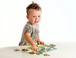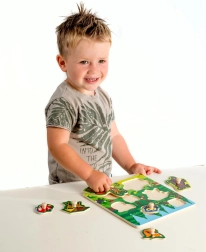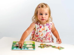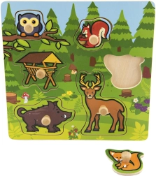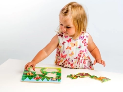 Lesné motívy ako sova, veverička, diviak či jeleň zábavnou formou motivujú k objavovaniu. Drevená podložka s rámikmi udrží každý dielik na svojom mieste a uľahčí správne priradenie podľa tvaru aj obrázka.