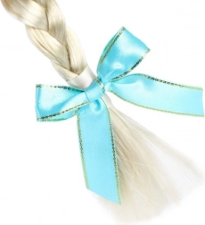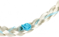 Elegantný blond vrkoč prepletený svetlomodrou stuhou a kvietkami dodá kostýmu jemnosť a rozprávkový šmrnc.