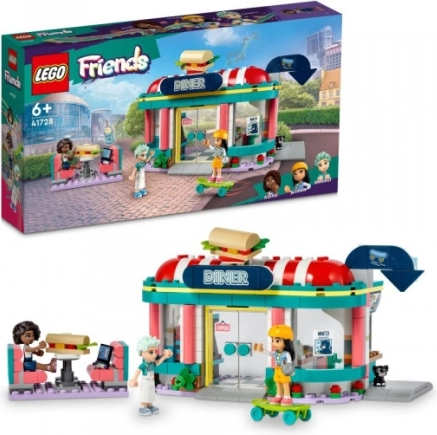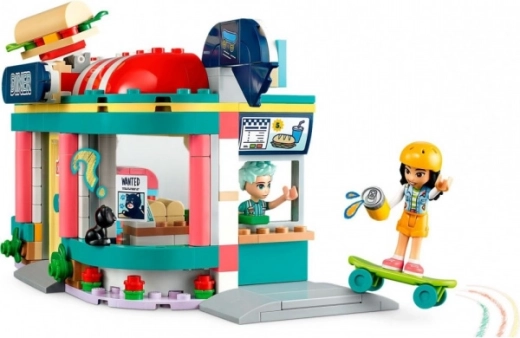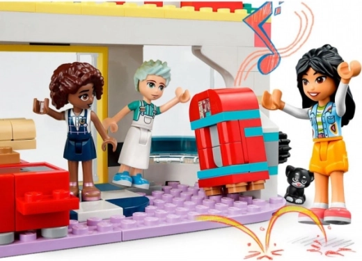 Vytvorte si vlastnú reštauráciu s farebnou súpravou LEGO Friends Bar v centre Heartlake, ktorá prináša drive‑thru okienko, vonkajšie sedenie, herný automat a pohyblivý jukebox. Deti si užijú prípravu sendvičov z chladničky, obsluhu zákazníkov aj jazdu na skateboarde – a možno príde aj prefíkaná mačka na návštevu!