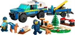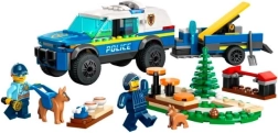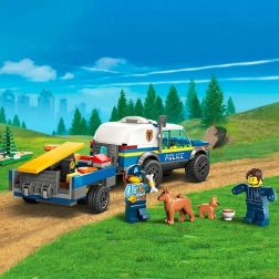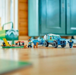 Tento akčný set prináša všetko pre realistický výcvik psov: stabilné policajné SUV K9 s prívesom, tri tréningové prekážky (hojdačka–rovnátko, plot a stupienky), prírodnú scénu a bohaté príslušenstvo. Deti ho ľahko postavia a hneď sa zahrajú na psovodov, ktorí vedú psa a šteniatko cez prekážky.