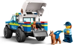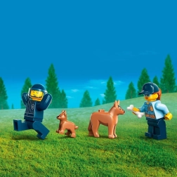 Dve minifigúrky policajtov, figúrka psa a šteniatka, plus kefa, baterka, lopata a maškrty – všetko pre živé role-play scény psovodov.