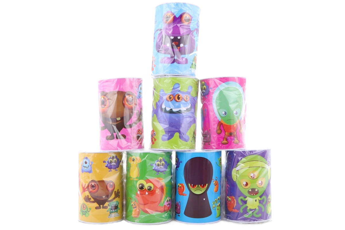 Plechová pokladnička s motívom príšerok s rozmermi cca 15 × 10 cm. Balené v sáčku. Pokladnička nemá otváranie. Vek 3+