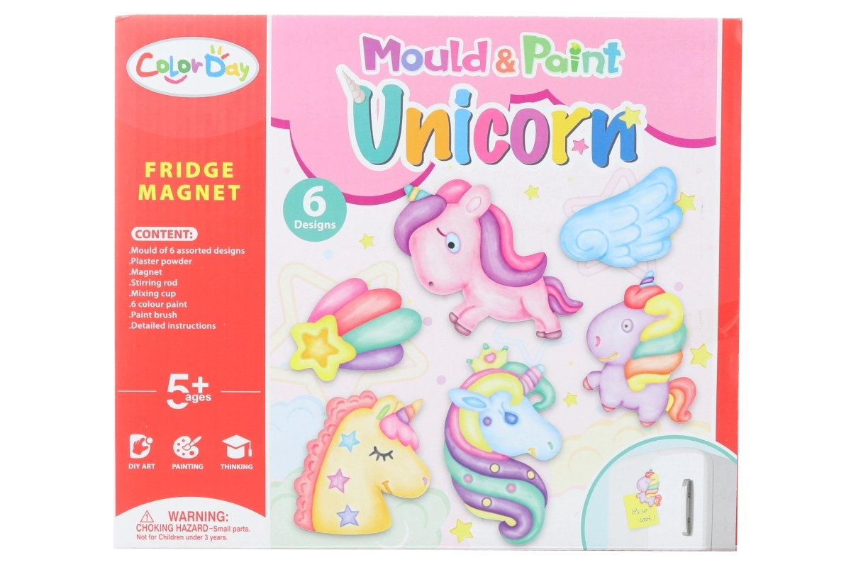 Balenie obsahuje sadru, plastovú misku, plastovú formu so 6 rôznymi motívmi, 6 farieb na vymaľovanie, štetec, magnety – môžete vytvoriť magnetku a návod na prípravu. Rozmer balenia 23 × 27 × 5,5 cm. Vek 5+
