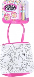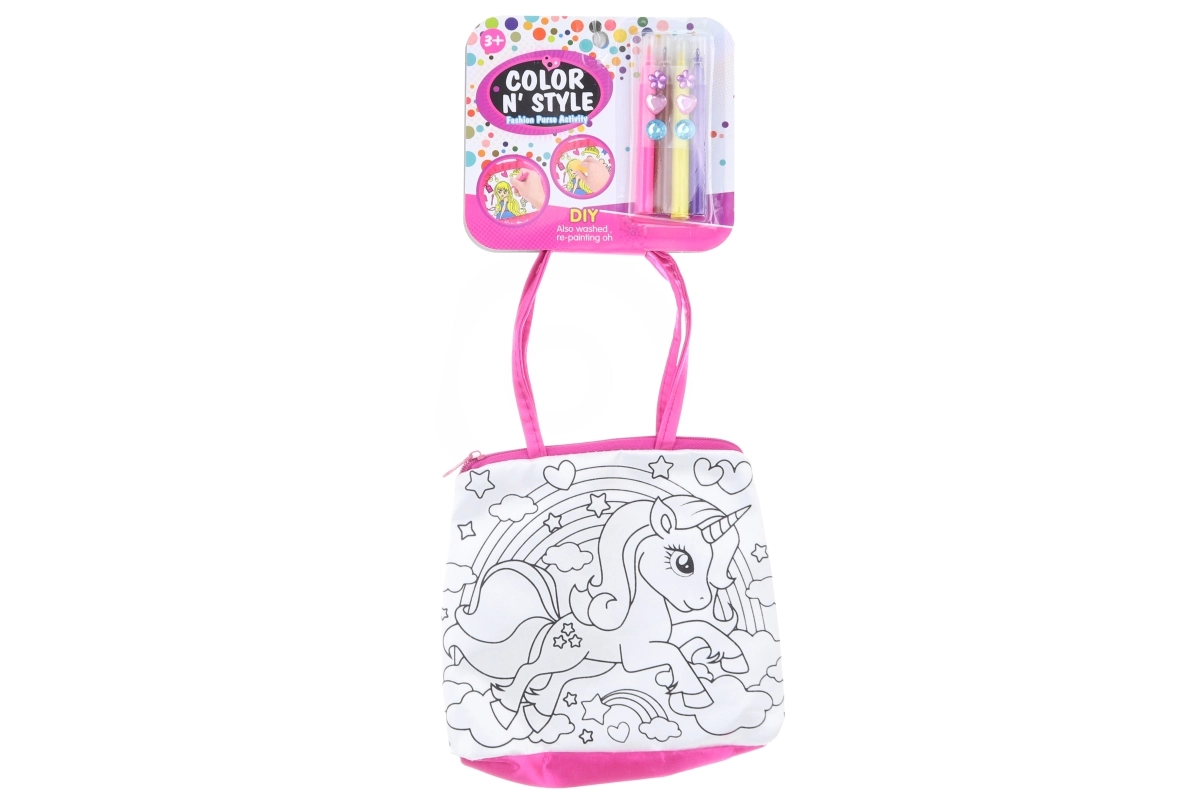 Kreatívna sada pre malých umelcov: vymaľovacia kabelka s rozmermi cca 16 × 16 cm, ktorá obsahuje 4 špeciálne textilné fixky a ozdobné kamienky. Ideálna na rozvoj kreativity, jemnej motoriky a originálneho štýlu. Vhodné pre deti od 3 rokov.