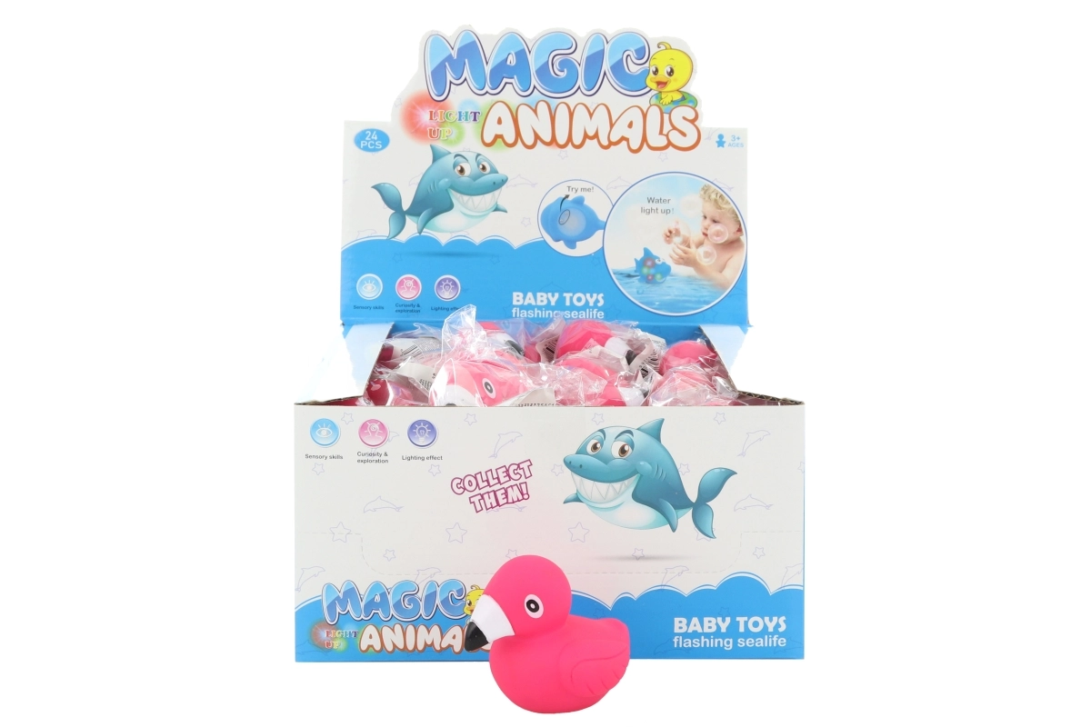 Svietiaci plameniak do vane. Obsahuje nevymeniteľné batérie. Rozmery cca 5,5 × 5 cm. Vek 3+