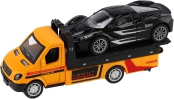 Toto realisticky spracované odťahové vozidlo s naloženým športovým autíčkom rozšíri detský vozový park o obľúbené pracovné auto. Vďaka spätnému natiahnutiu stačí zatlačiť, pustiť a sledovať akciu – perfektné pre scénky z mesta, cesty aj autodielne.