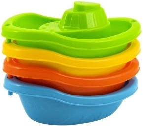 Sada obsahuje štyri lodičky v žiarivých farbách – modré, oranžové, zelené a žlté, ktoré možno jednoducho stohovať pre jednoduché uloženie. Tvar a farby lodí podporujú detskú predstavivosť a kreativitu počas vodnej zábavy.