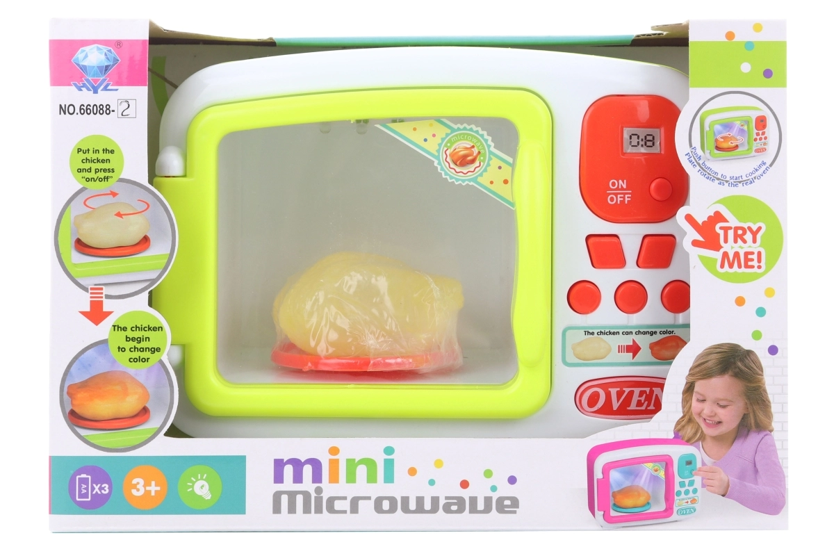 Zábavná detská mikrovlnná rúra na batérie prináša realistický herný zážitok. Vydáva reálne zvuky, pri „ohrievaní“ svieti a otáča sa vnútorný tanier. Súčasťou je plastové kurča, ktoré mení farbu – po „upečení“ stmavne a po vybraní opäť zosvetlie. Perfektná hračka pre malých kuchárov od 3 rokov.