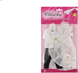 Obsahuje biele šaty, čipkované závoje a elegantný čierny oblek s bielou košeľou, doplnené kvetinovými a kytičkovými doplnkami.