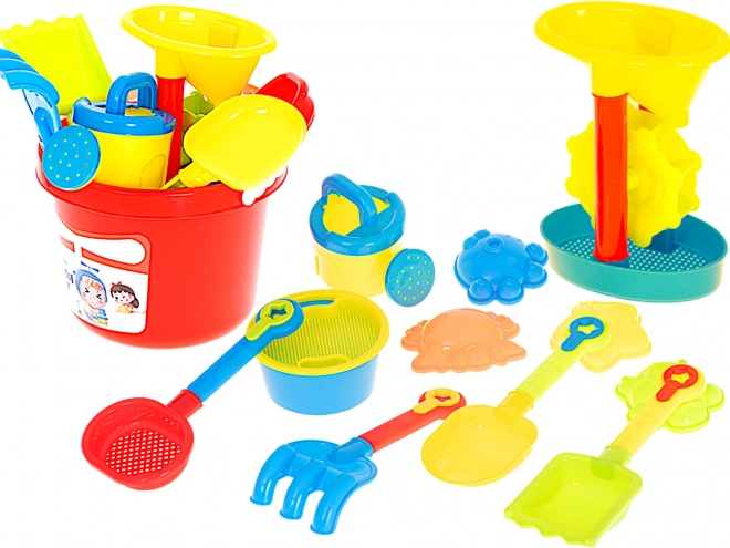 Príslušenstvo pre pieskovisko - vedierko s pieskom, formičky, mlynček na zalievanie - 13 dielov