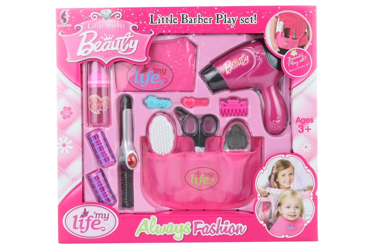 Súčasťou je funkčný fén na batérie (napájanie 1× AA, nie je súčasťou balenia), bezpečné detské nástroje a praktický kapsár na prehľadné uloženie všetkých kaderníckych pomôcok.