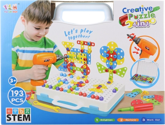 Skrutkovacia stavebnica s vŕtačkou, 193 dielov, kufrík a návod. Rozvíja kreativitu a motoriku detí od 3 rokov. Vŕtačka na 2× AA batérie. Skvelé darčekové balenie.