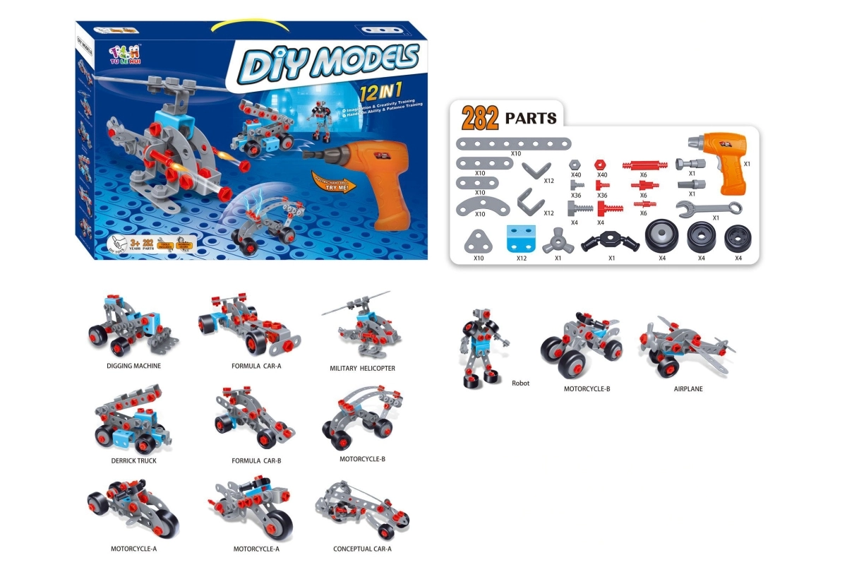 - Bohatá výbava: 282 dielikov, detská vŕtačka, skrutkovač, návod