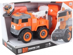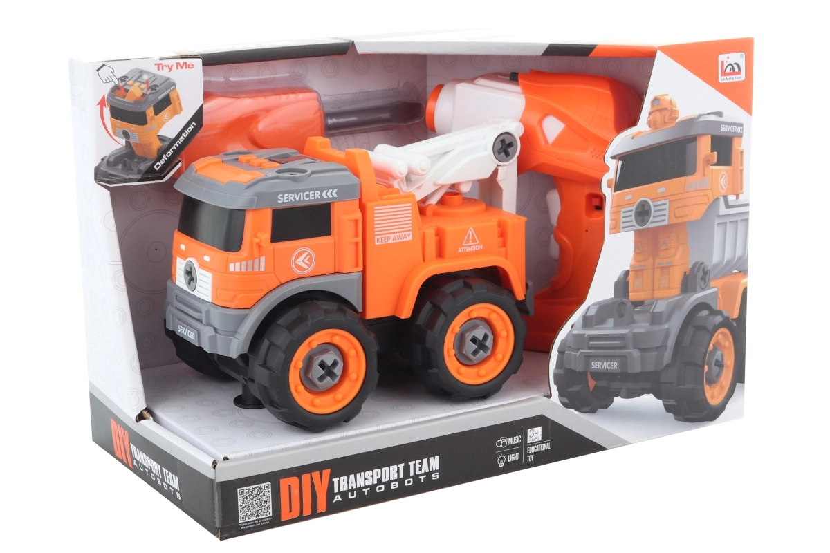 Zábavná stavebnica a RC hračka v jednom! Táto skrutkovacia odťahovka sa dá pomocou priloženého skrutkovača alebo vŕtačky ľahko rozobrať a znovu zložiť, navyše ju môžete transformovať na robota. Vyberateľný motorček z vŕtačky sa vloží do auta a to potom jazdí na diaľkové ovládanie dopredu aj dozadu. Hračka svieti a vydáva zvuky, podporuje jemnú motoriku a kreativitu detí. Ideálne pre deti od 3 rokov.